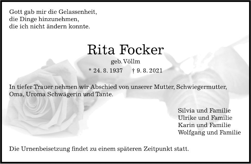 Rita Fockergestorben am 9. August 2021